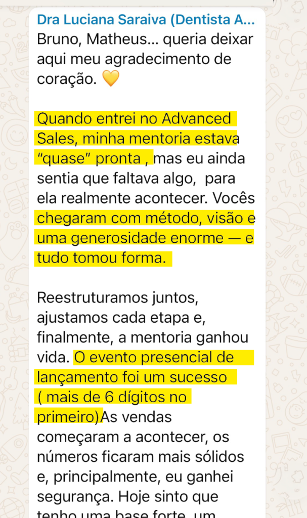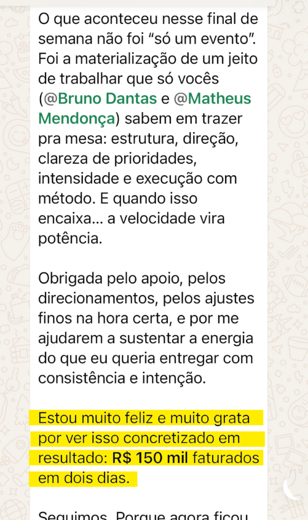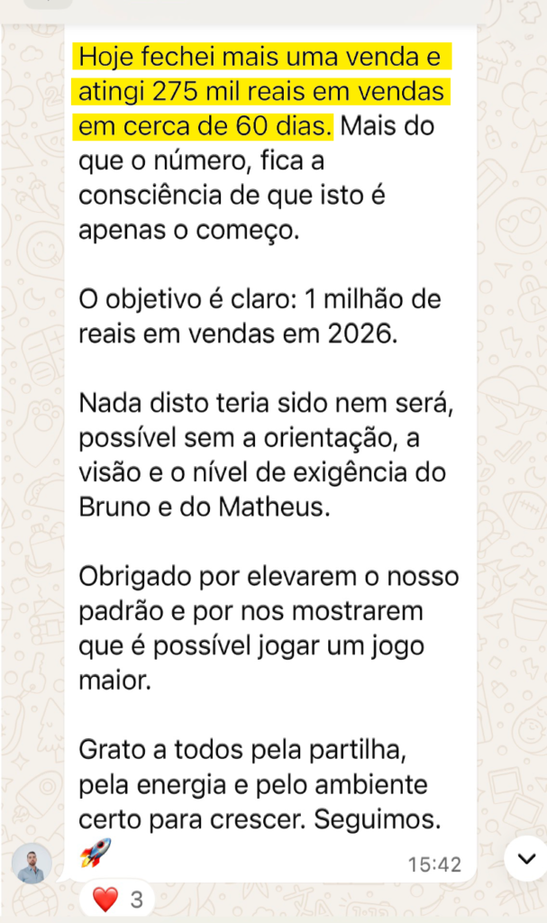 Você sai com estrutura, direção e um padrão de vendas que sustenta crescimento.